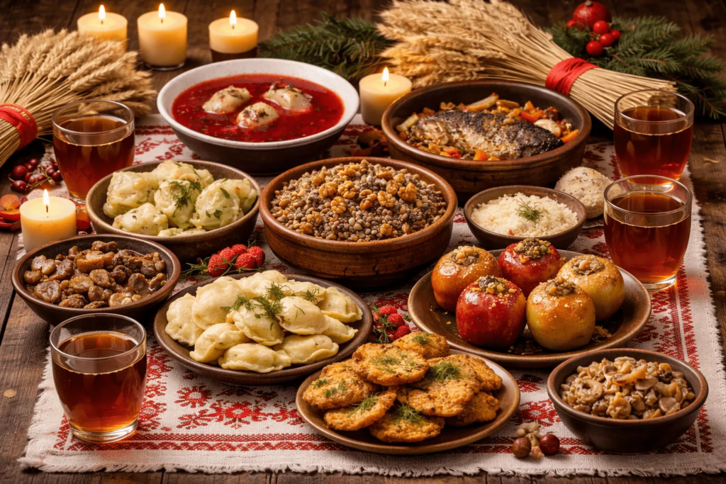 - Кутя — головна ритуальна страва з пшениці, меду та маку, що є символом вічного життя